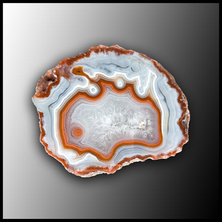 This polished specimen features translucent, white, and orange agate with tight banding and a crystal center.