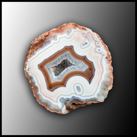 This polished specimen features white, yellow-orange, and pale peach agate with a crystal-filled vugg.