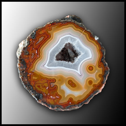 This polished specimen features yellow, orange-red, and white agate with a crystal-coated vugg.