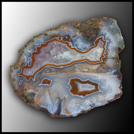 This polished specimen comes from the High Atlas mine in Morocco. The back of the specimen is cut flat. The agate features a needle-like inclusion that creates a separation between the patterns on the two sides of the agate. Mossy and banded agate in translucent blue-gray, white, yellow, and orange is scattered throughout and a section of clear and pink quartz.