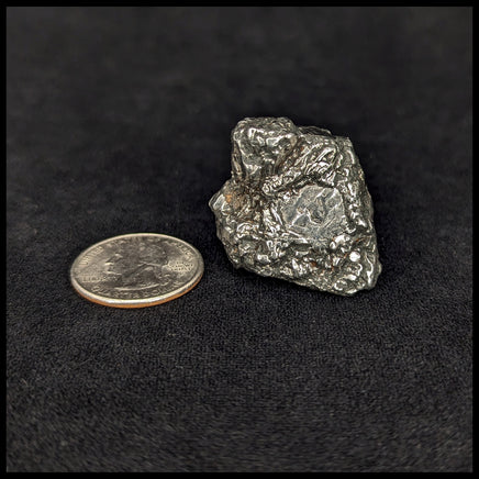 Meteorites were discovered near Nantan in Guangxi, China in 1958. The location could possibly match a recorded fall from May of 1516, but not enough information is known. The possibility is based on comet observations describing stars "five to six fold long, waving like snakes and dragons" from historical Chinese records. Nantan Meteorites are sometimes called Kamacite, which is an alloy of iron and nickel only produced in meteorites. They have an octahedral structure and show Widmanstätten patterns/Thompson structures. Shown next to a quarter for size.