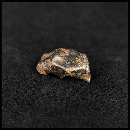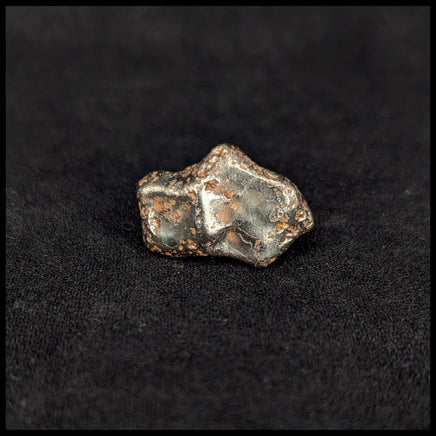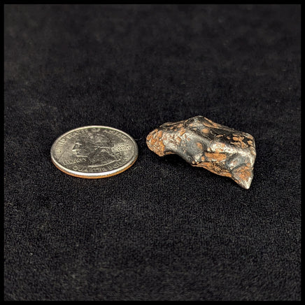 Sikhote-Alin Meteorites have high iron content and come from the Sikhote-Alin Mountains in Russia. At 10:38am on February 12, 1947, a bright fireball appeared in the sky and exploded in our atmosphere before the pieces landed among the mountains. The flash and sound of the fall were observed for almost 200 miles around the impact, and the long smoke trail inspired a commissioned stamp on the 10-year anniversary of the event - painted by an artist who witnessed the event. Pictured next to a quarter for size.