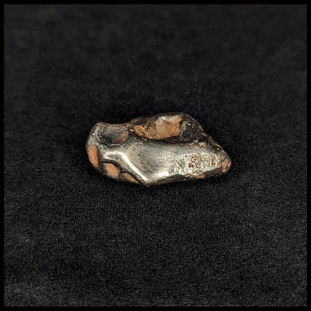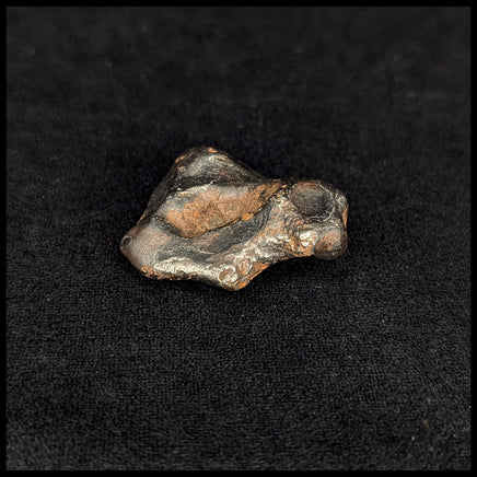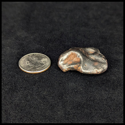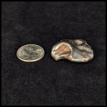 Sikhote-Alin Meteorites have high iron content and come from the Sikhote-Alin Mountains in Russia. At 10:38am on February 12, 1947, a bright fireball appeared in the sky and exploded in our atmosphere before the pieces landed among the mountains. The flash and sound of the fall were observed for almost 200 miles around the impact, and the long smoke trail inspired a commissioned stamp on the 10-year anniversary of the event - painted by an artist who witnessed the event. Pictured next to a quarter for size.