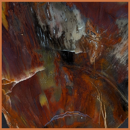 Polished Petrified Wood thick slab from Arizona, USA. This piece features nice ring patterning in gorgeous yellow, orange, and red throughout, a tan and brown section like classic wood, and hints of magentas and blue. The back has been treated with glue to fill and stabilize a fracture.