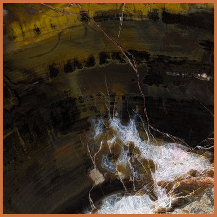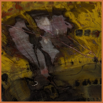 Polished Petrified Wood thick slab from Arizona, USA. This piece features nice patterning in strong yellow, red-orange, brown, and black, with hints of magenta and quartz crystal along one edge.
