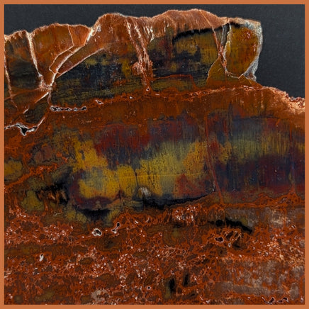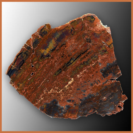 Polished Petrified Wood thick slab from Arizona, USA. This piece features intricate patterning in brick red with yellow, black, gray-blue, and magenta.