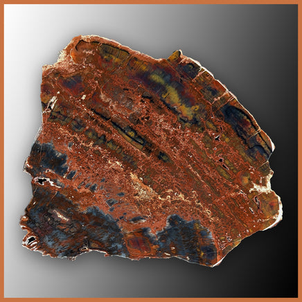 Polished Petrified Wood thick slab from Arizona, USA. This piece features intricate patterning in brick red with yellow, black, gray-blue, and magenta.