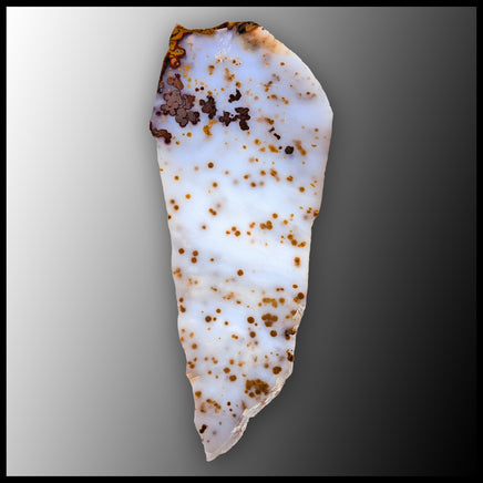 A vein agate from central Oregon that contains opaque jasper and translucent agate with orbicular patterns that lend to its name. This polished slab of Polka Dot features reddish and golden orb clusters inside streaky off-white with slight hues of blue,