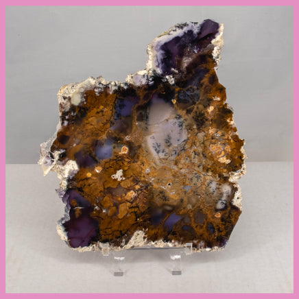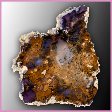 From Nevada, Purple Sage Agate forms large irregular nodules with beautiful coloring inside. This polished slab features gold and purple coloring in various shades, with healed brecciation, a white outer host rock, and numerous black dendrites.