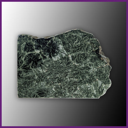From Russia, Seraphinite is named for its feathery appearance - drawing from the biblical seraphim angels. It has metallic shades of forest green with silver chatoyancy. This polished slab has two cut edges along with the natural edge.