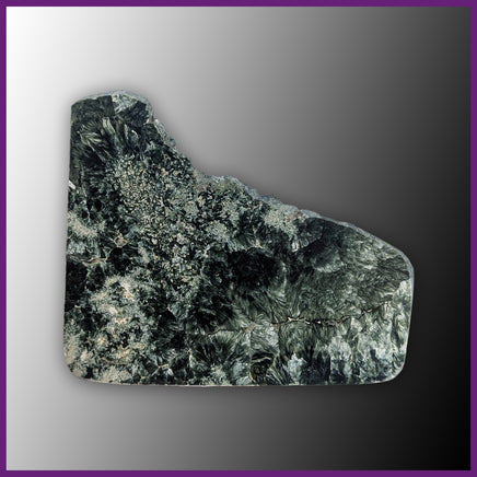 From Russia, Seraphinite is named for its feathery appearance - drawing from the biblical seraphim angels. It has metallic shades of forest green with silver chatoyancy. This polished slab has three cut edges along with the natural edge.