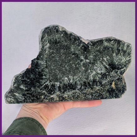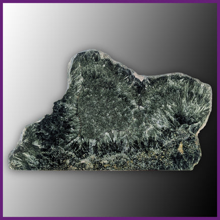 From Russia, Seraphinite is named for its feathery appearance - drawing from the biblical seraphim angels. It has metallic shades of forest green with silver chatoyancy. This polished slab has one cut edge along with the natural edges, and sprays of the classic feathery shape. The bottom edge has some natural open pocketing that has been treated with resin to match the color of the polished surface.