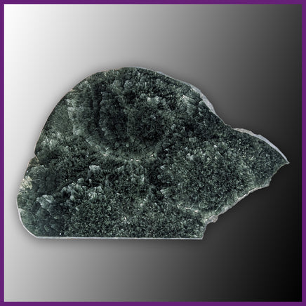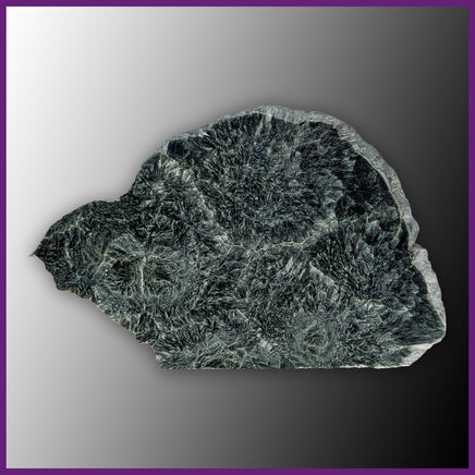 From Russia, Seraphinite is named for its feathery appearance - drawing from the biblical seraphim angels. It has metallic shades of forest green with silvery chatoyancy. This slab has one cut edge along with the natural edges, and is polished on both sides.