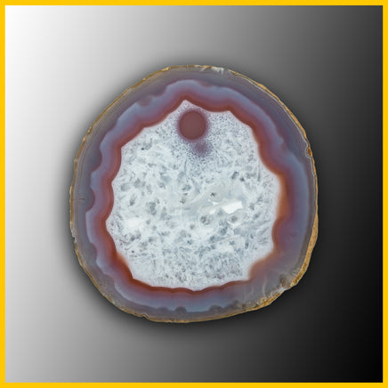 This is a polished specimen featuring rose, grey-blue, and white agate with a distinct circular formation. This agate is from Tete, Mozambique.