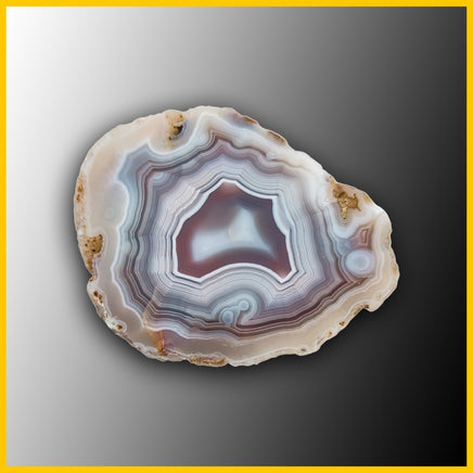 This is a polished specimen featuring white, grey, and dark pink agate with parallax.