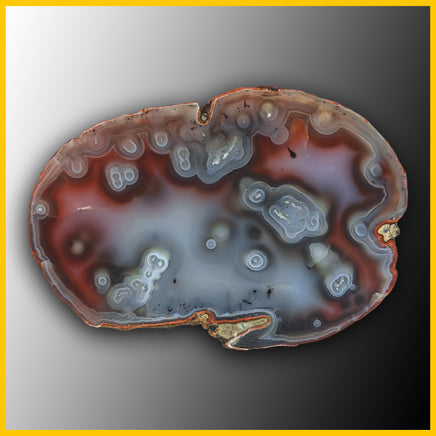 This is a polished specimen featuring colorful grey blue fading to purple, pink, and red, with light gray tubes and banding.