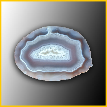 This is a polished specimen featuring pale grey agate in cooler or warmer tones, with a crystalline center.
