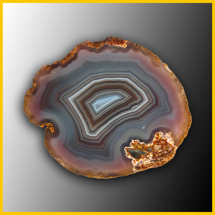 This is a polished specimen featuring blue-grey and pale purple agate with grey and white banding and hints of parallax.