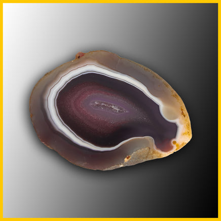 This is a polished specimen featuring grey agate, white banding, and a center gradient from pale mauve to deep magenta to black.