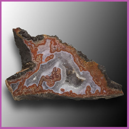 This specimen features red-orange and lavendar agate with yellow-green moss inclusions and an open quartz center.