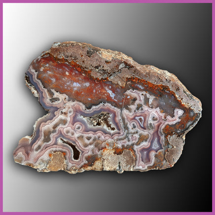 Polished Agua Nueva Agate specimen featuring pale mauve and pink banding with orange moss agate.