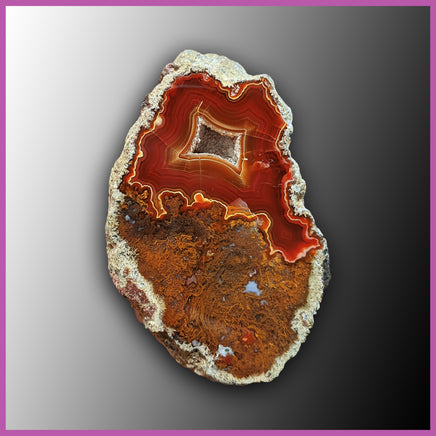 Polished Agua Nueva Agate specimen featuring red and orange banding with golden brown moss agate and a vugg.