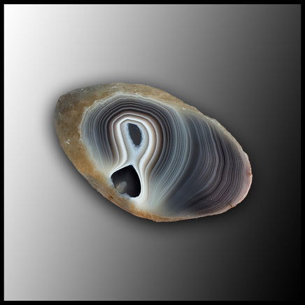 This Botswana Agate polished specimen features shades of white and gray banding that blends to hints of pale pink, with a high-contrast flow-channel in almost black agate.