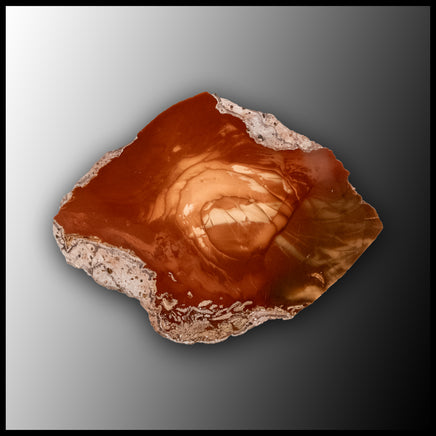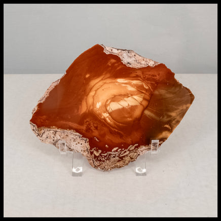 Bruneau Jasper comes from thundereggs in the Bruneau Canyon in Idaho, and is so known for its egg-patterning that the feature is sometimes called 'Bruneau patterning' in other rocks. This polished slab shows deep and earthy orange jasper with a lighter colored brecciated egg in the center. Hints of brown and tans are intermingled with healed brecciation lines, and light host rock is included on the sides.