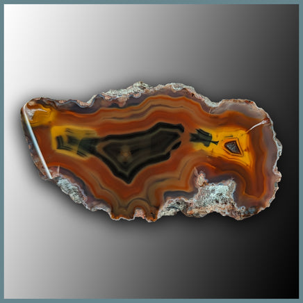 A polished Condor Agate specimen featuring opaque black, gray, red-orange and yellow banded agate with spots of chromatography and translucent agate around the edges.