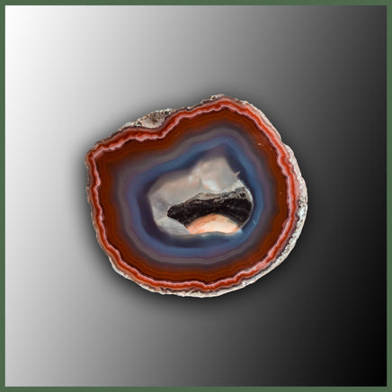 A polished specimen featuring red and blue agate with a vugg in the center.