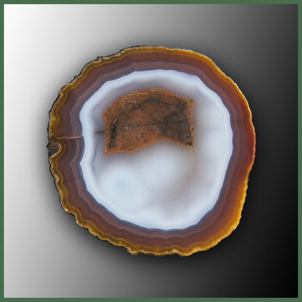 This small polished Coyamito Agate specimen has a white and gray center with a shallow vug, surrounded by banded agate in grayish-blue, pink, and yellow with faint parallax.