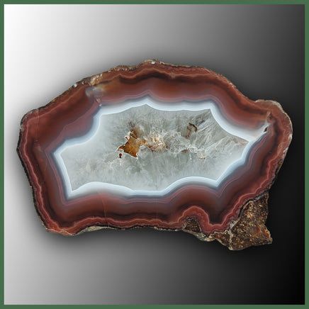 This polished Coyamito Agate specimen has a quartz center surrounded by white, blue-gray, light pink, and red banded agate.