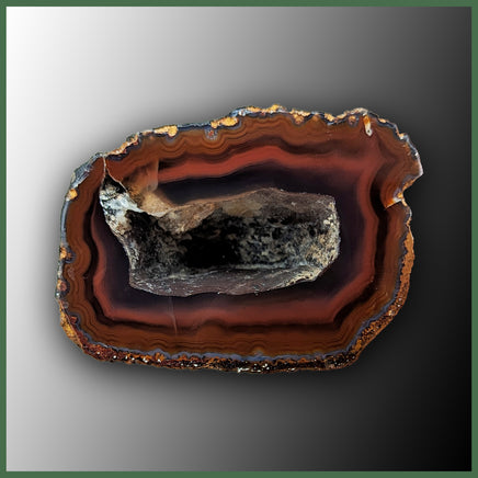 This polished Coyamito Agate specimen has a large vug and distinct flow channel. The agate is a deep blue-gray with banding in red, red-orange, and light blue along the edge.