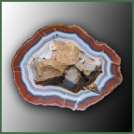 This Coyamito Agate specimen is polished over a slight curve and has a large vug with some parts covered in druzy, and some parts showing the botryoidal formation. The banding around the vug and flow channel is white, blue-gray, red-orange, and a thin band of pink is along the outer edge.
