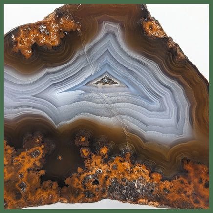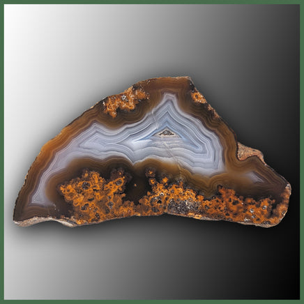 This polished Coyamito Agate specimen features pale blue-gray banded agate in the center, surrounded by golden yellow with parallax in several spots. Golden, mossy inclusions line most of one edge and peak out from the edge in two other spots.