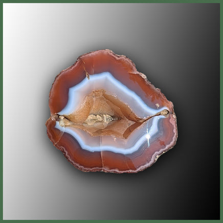 This small Coyamito Agate specimen is polished over a slight curve and has a large vug. It has red, dark translucent blue-gray, and white banded agate with two distinct flow channels.