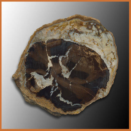This specimen, from Big Sandy Reservoir, features black and brown wood with a light blue and creamy white agate. The back side is treated with resin for strength, polished on one side by dry lap method.