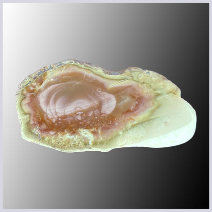 A polished specimen with white, green, pink, and red jasper with slight egg pattering.