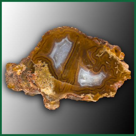 A polished specimen featuring golden yellow agate with banding and two sections of pale blue-gray quartz.