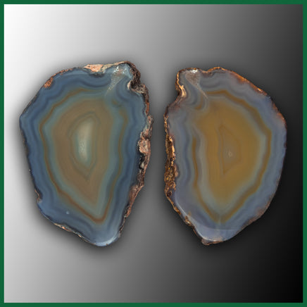 A polished specimen pair featuring mostly opaque blue and yellow agate with banding.