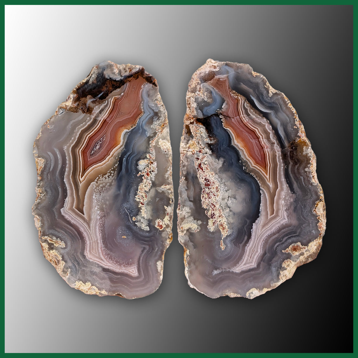This polished Laguna Agate specimen pair features a prominent flow channel with red-orange to light pink banding, with speckles of color clinging to the bands. This appears to float within translucent blue agate with faint concentric banding. A mossy host inclusion protrudes into the nodule, which the main section of banding curves around.