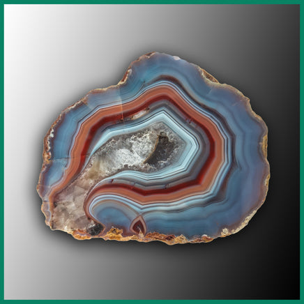 This polished specimen features banded agate in light blue, pale orange, red, and white, with beautiful parallax. A flow channel with quartz and a small crystal vugg come from the side to center of the nodule.