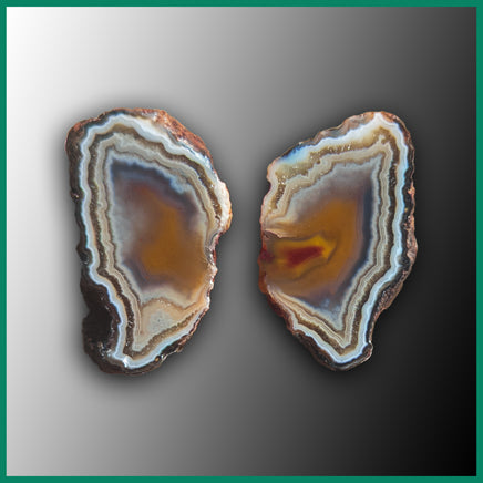 A polished specimen pair featuring fine white banding in translucent agate, with center coloring in red, yellow, and translucent purple-gray.