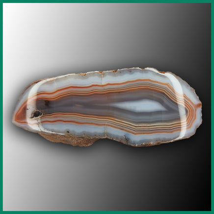 Malawi Agate polished specimen featuring white, translucent gray, and orange banded agate with strong parallax, polished over a curve.