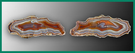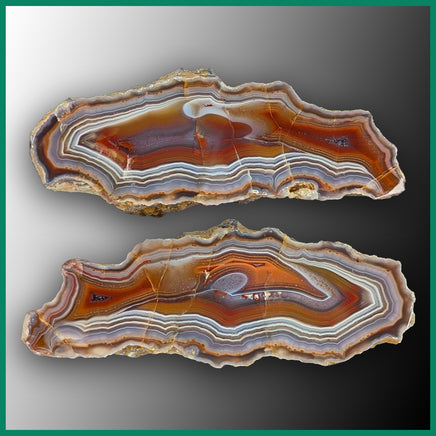 This Malawi Agate polished specimen pair features colorful golden orange to deep red, light blue, and white banding multiple 'centers' of patterning, fractures with golden staining, and speckled drops of color.