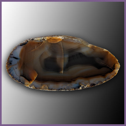A polished specimen featuring translucent blue-gray agate with sections of color change to shades of black, gray, and brown, and banding in orange.