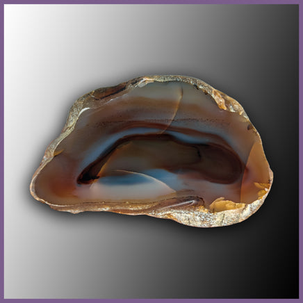 A polished specimen featuring translucent agate in milky shades of white, blue, orange, red, and brown. Tiny dark brown speckles of dendrites are visible going back into one of the layers.