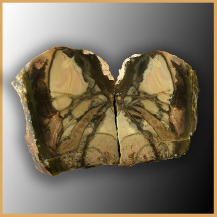 This specimen features yellow-green, cream, brown, and blue-green jasper.