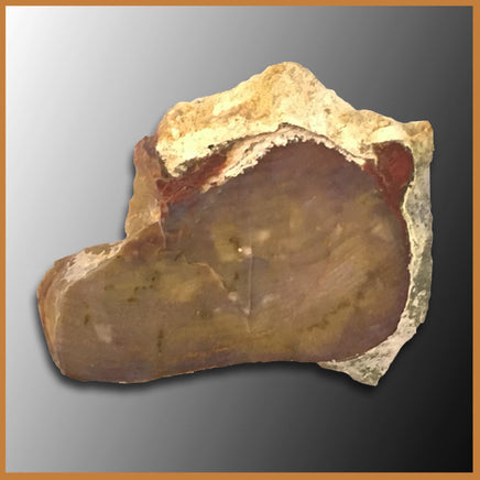 This specimen is a polished slab, which is approximately 0.50" thick. It displays brown, red, and blue coloring with a tan bark edge.