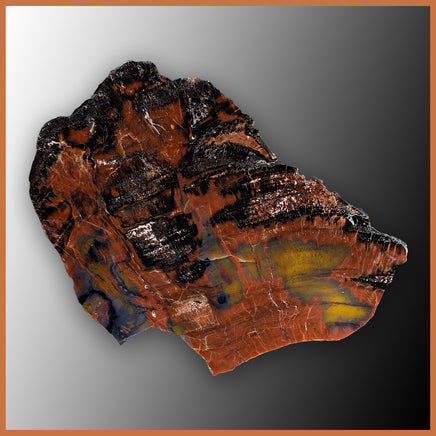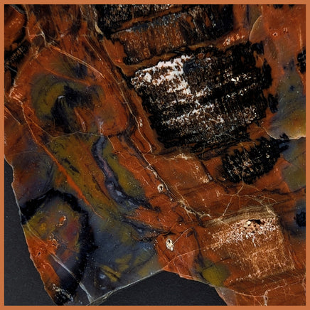 Polished Petrified Wood thick slab from Arizona, USA. This piece features intricate patterning in brick red with additional coloring in yellow, black, and blue.